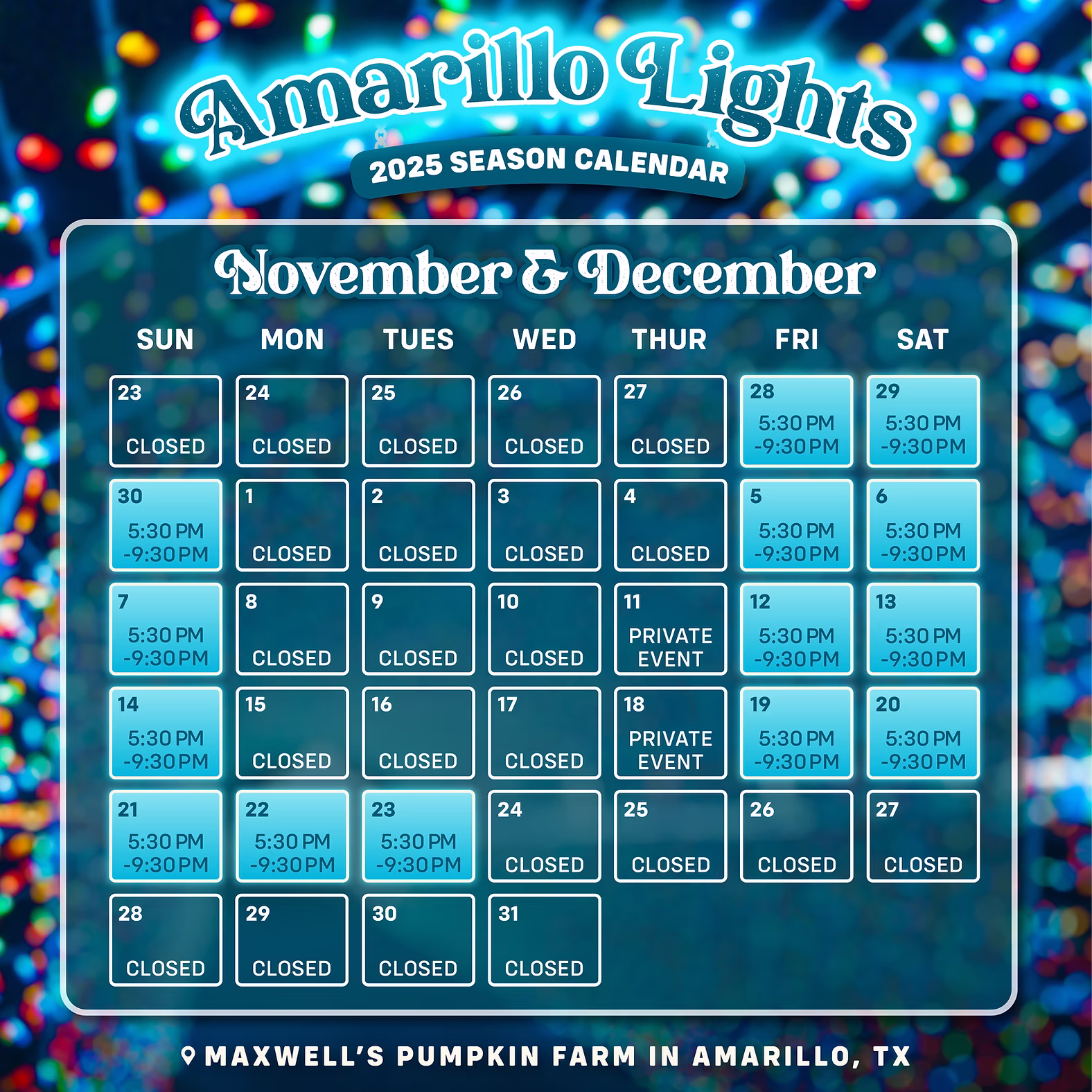 Maxwell’s Pumpkin Farm is the ultimate family fun destination in West Texas! In the Fall, stroll through our sunflower fields, corn maze, pick out the perfect pumpkin & enjoy 30+ farm fun attractions. In the Winter, visit Amarillo Lights at Maxwell’s, where you can experience our Trail of Lights, visit Santa & Christmas fun for the whole family. See you on the farm soon!